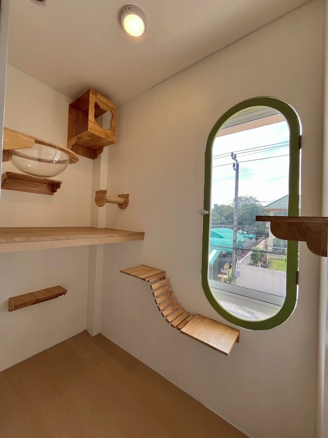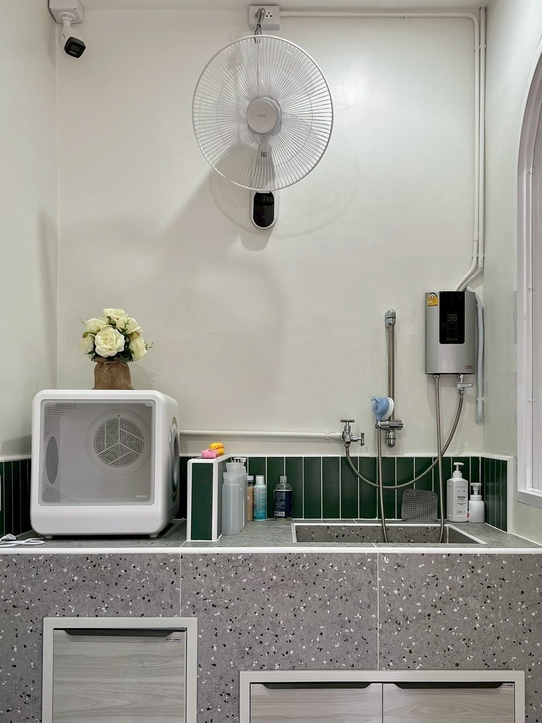 – มีห้องอาบน้ำ-ตัดขนแมว 1 ห้อง เป็นห้องกระจก